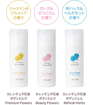 肌を守る「カレンデュラオイル」やキメを整えハリ感をアップする「ヒアルロン酸」、「コラーゲン」を共通成分として配合。気分や使うシーズンで選べるボディ保湿ケアシリーズです。