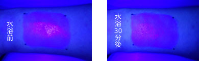 疑似海水に「森の肌守り。UV」を塗った腕を30分浸けた後もしっかりと残っていることが確認されました!