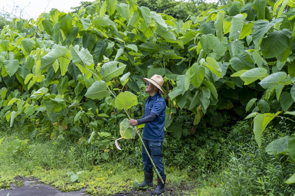 北海道のイタドリは3メートル近くまで成長する高い草丈と大きな葉が特徴で、「オオイタドリ」と呼ばれています。人力で掘り起こすのが困難なほど土中に深く根を張り巡らせ、抜いても抜いても⽣えてくる強い生命力ゆえに「ほかの植物の⾃⽣を妨げる」ともいわれてきました。