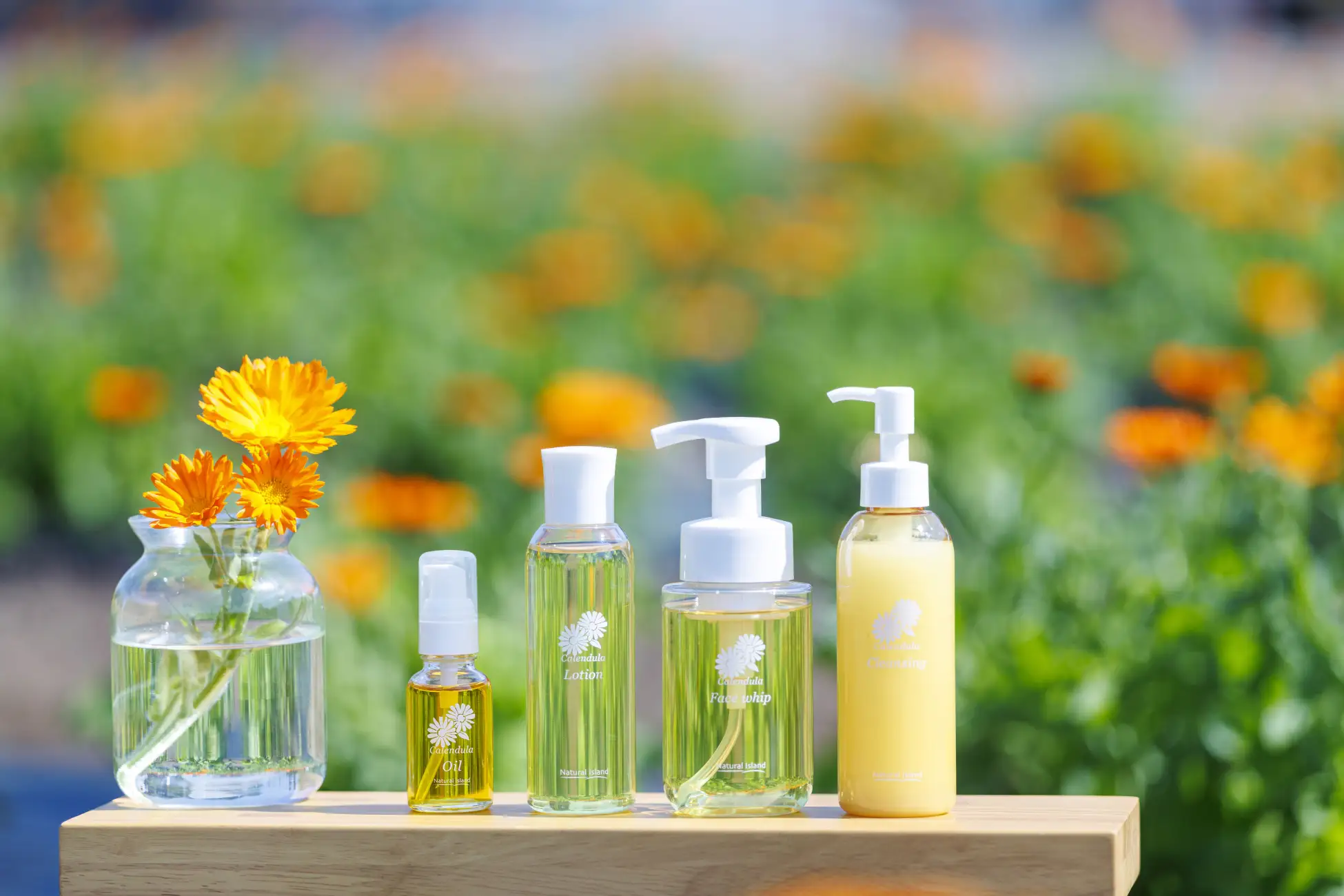 このシリーズには、自社農園で育てたカレンデュラの花を使用し、独自製法で抽出した「カレンデュラオイル」「カレンデュラ花エキス」「カレンデュラ花発酵エキス」などの成分を贅沢に配合。自然と向き合い、手間を惜しまないモノづくりから、毎日のスキンケアを心ほどける特別なひとときにします。