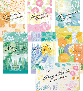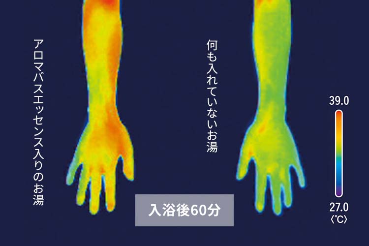 アロマバスエッセンスの香りでリラックスすると筋肉がゆるんで血流がアップ。体の芯まで温まり、湯上がり後も温かさが続きます。