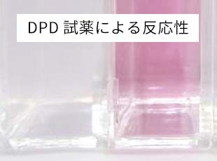 水道水は塩素と試薬が反応して赤くなっていますが、アロマバスエッセンスを入れた水道水は赤く反応していないことが分かります。