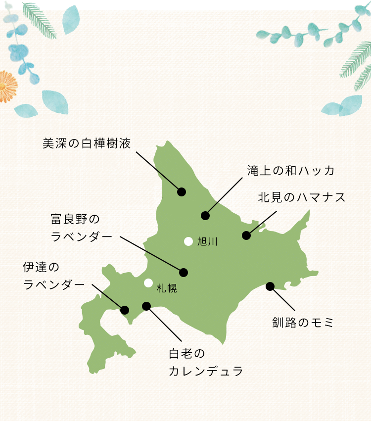 アロマバスエッセンスは、北海道産の精油を多く取り入れているのも特長です。精油の多くはヨーロッパ産ですが、北海道産の精油は繊細でやわらかい香りで、まったく違うものです。
