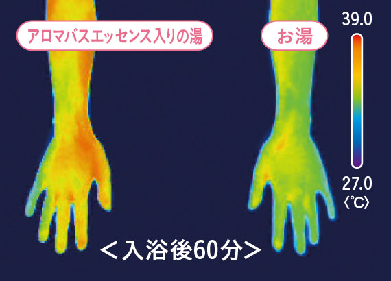 アロマバスエッセンスを入れたお湯に入ると、香りの効果でリラックスして入浴後1時間たっても体がぽかぽか!冷えが気になる方におすすめ。