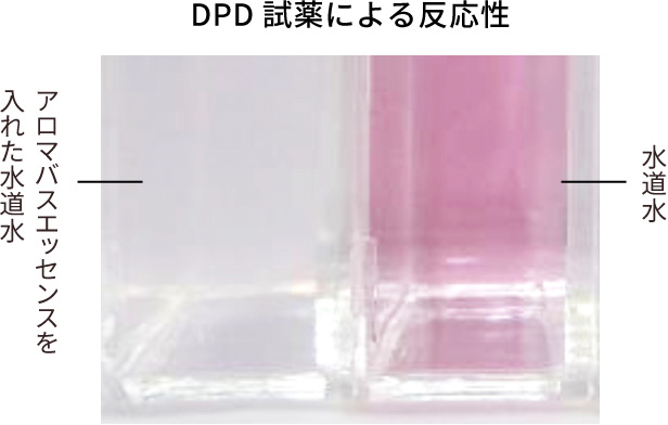 水道水は残留塩素と試薬が反応して赤くなっていますが、アロマバスエッセンスを入れた水道水は赤く反応していないことが分かります。