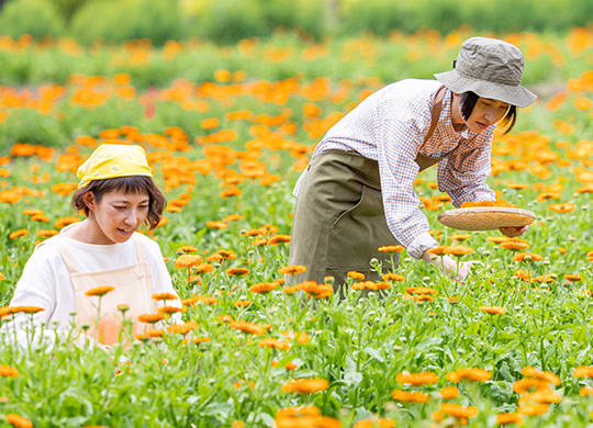 北海道で有機栽培されたカレンデュラを1つずつ手作業で摘み、花びらだけを取り分けて使います。丁寧に手作業ですることで花を傷めず、不純物が入らない高品質なオイルやエキスができるのです。