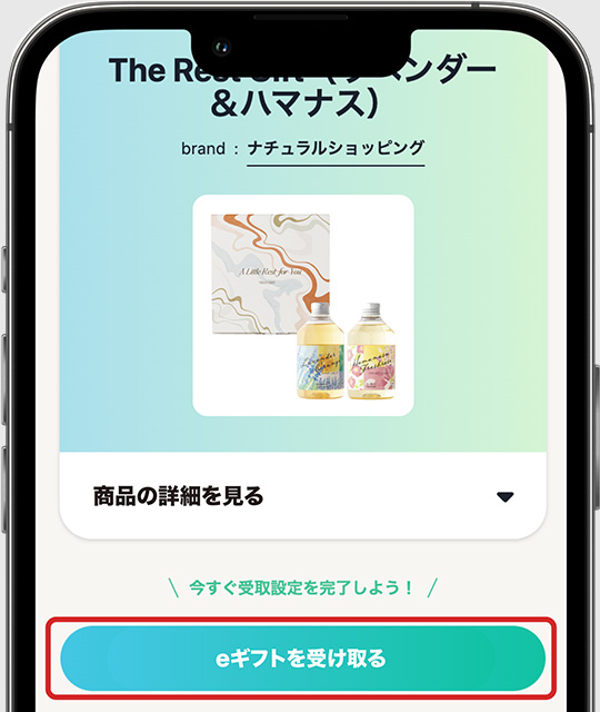 URLをタップすると受け取り画面が表示されます。「eギフトを受け取る」をタップしてお届け先情報の入力に進みます。