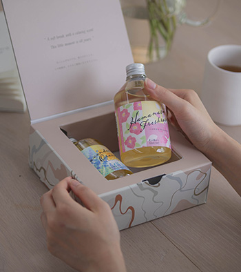 ギフトボックスはそのままお渡しいただけるボックスになっていますが、ラッピングはお電話にて承っております。ご希望の際には、ご注文後すぐにフリーダイヤルまでご連絡ください。 ギフトセットのラッピング、のし対応は250円(税込)で承っております。