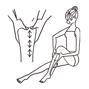 - @まず左足から行いましょう。サポートオイルを手に取ったら、両手でV字をつくって脚の表面に密着させ、体重を掛けながら太ももの付け根から足首までなで下ろします。