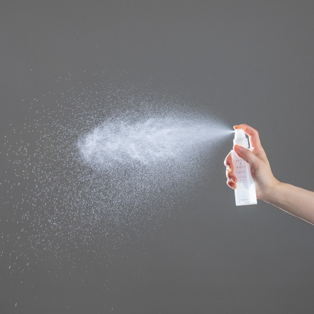 肌にかかるように吹きかけてから、軽く抑えてください。メイクの仕上げや日中の保湿以外にも、お風呂上がりの全身保湿に、朝の寝ぐせ直しにも◎