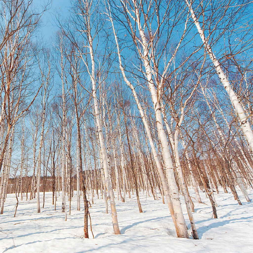 春でも雪深い、美深町の白樺の森。