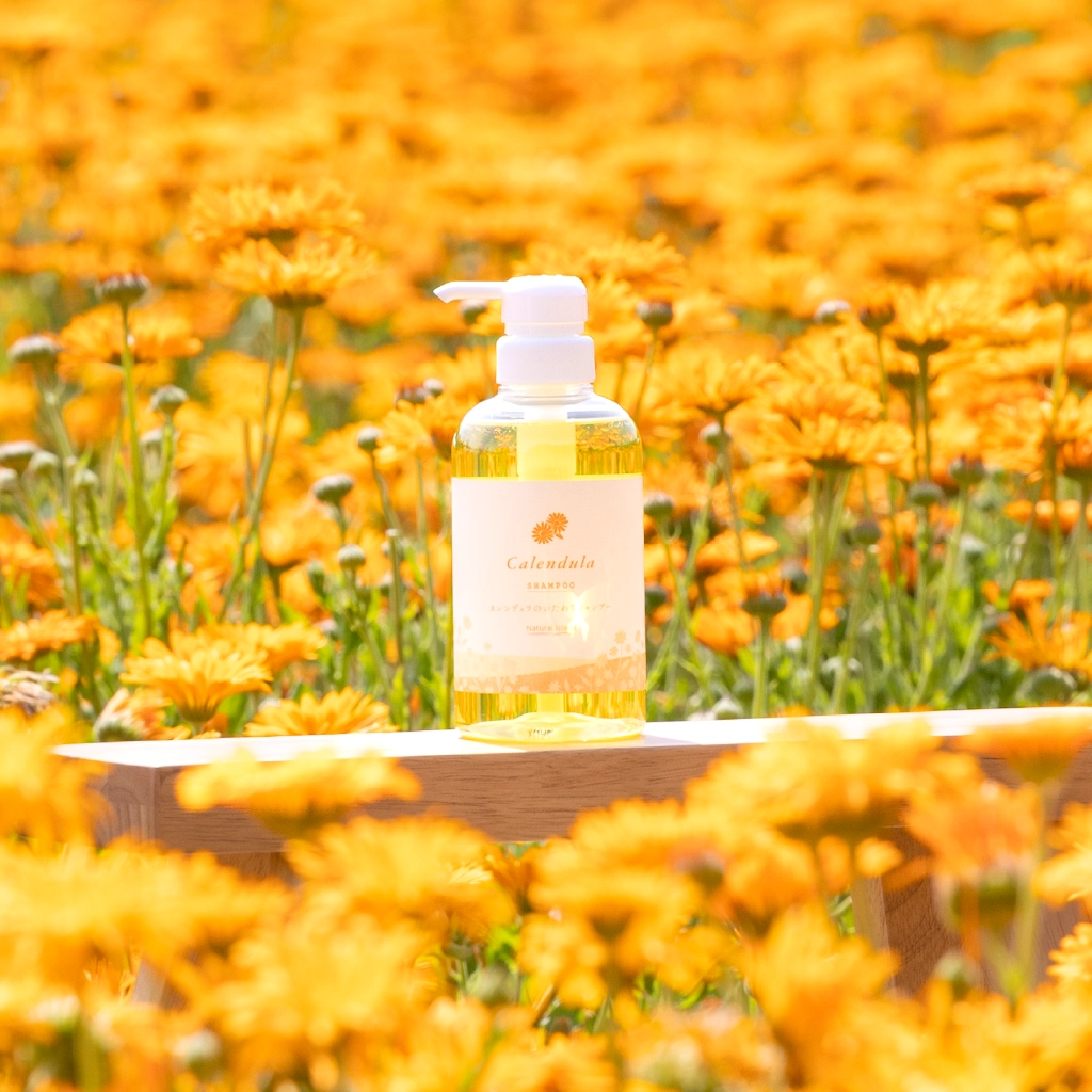 丁寧に手づみした有機カレンデュラの花びらを、保湿成分(BG)で抽出。傷んだ髪や頭皮を補修しすこやかに整えます。