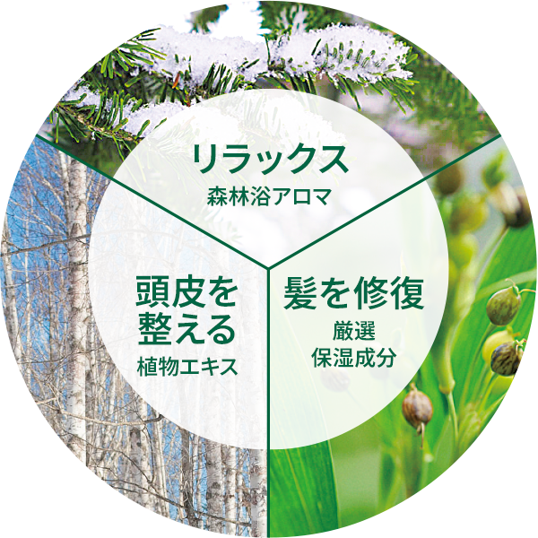 森林浴アロマと植物由来成分が、オイリードライな頭皮、ダメージを受けた髪、日々のストレスと3方向からアプローチ。頭皮の皮脂バランスを整え、ナチュラルでしなやかな髪へ導きます。
