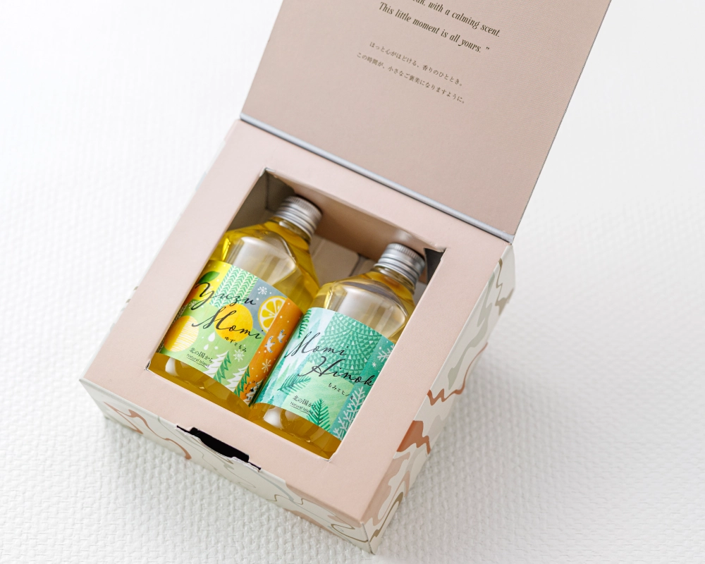セット内容:アロマバスエッセンス ゆずともみ・もみとヒノキ 各300ml1本ずつ・ナチュラルアイランドオリジナルショッパー1枚
