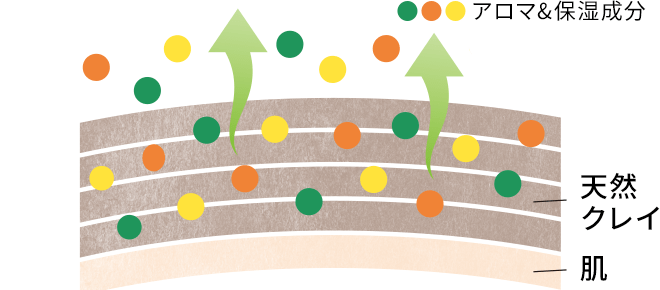 天然クレイの層にアロマを入れる技術により、香りのベールが長続き。天然クレイのサラッとした質感で、ベタつかず、サラサラとした肌をキープ。